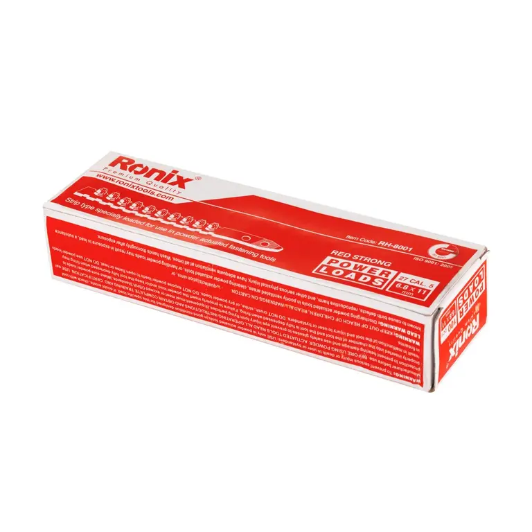 مدل RH-8001 رونیکس دارای کارتریج 10 عددی چاشنی مخصوص تفنگ های میخکوب بوده که از قدرت شلیک بالایی برخوردار می باشد و برای متصل کردن انواع سطوح بتنی و فلزی مناسب است. این چاشنی ها در نوار پلاستیکی قرمز رنگ عرضه می شوند که رنگ آن ها نمایانگر میزان سرعت آن هاست. چاشنی تفنگ میخکوب قرمز رونیکس دارای قدرت 5 است.